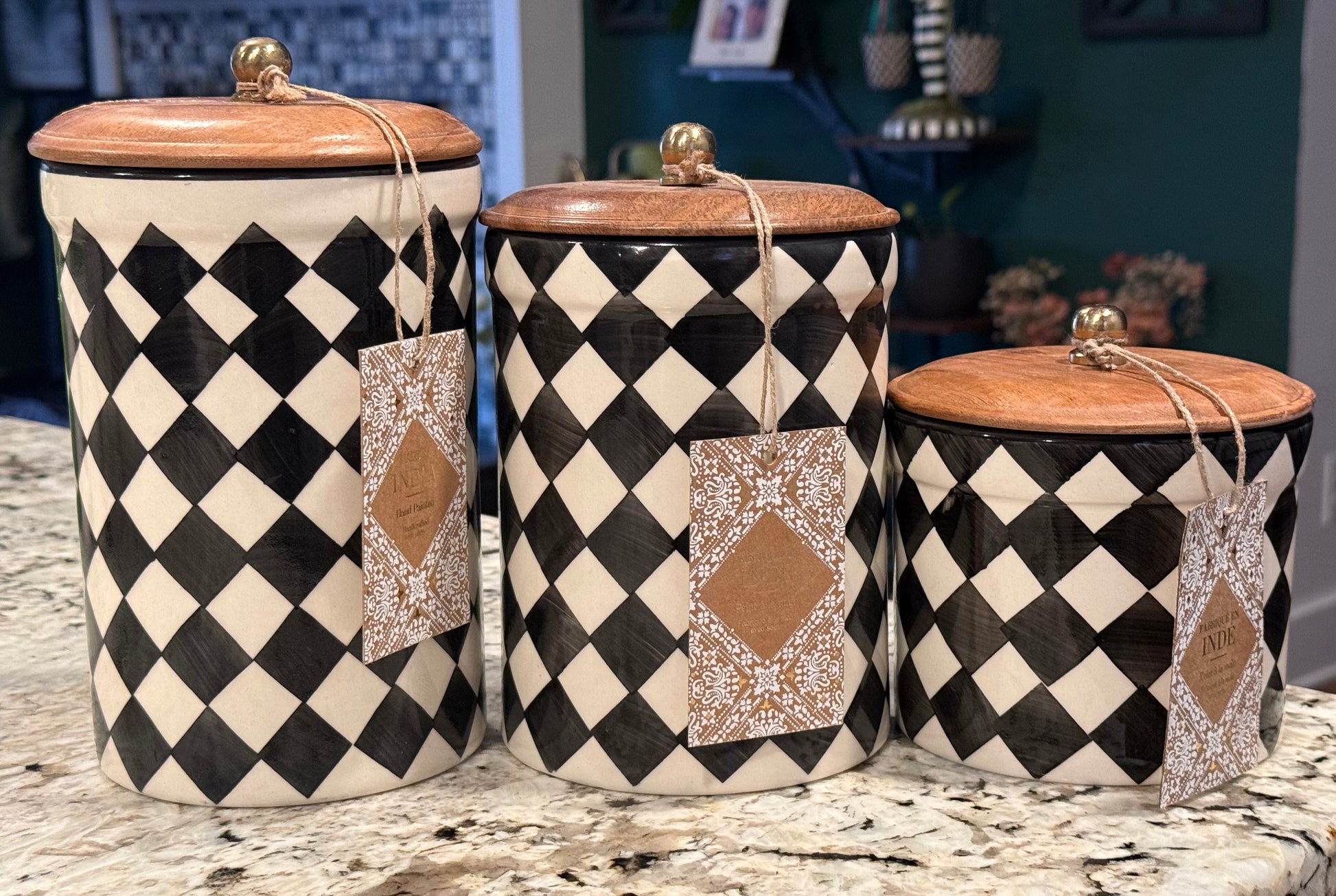New 3-piece Made in India ceramic canister set black diamond check pattern 8.5” 7” 5.5” size.