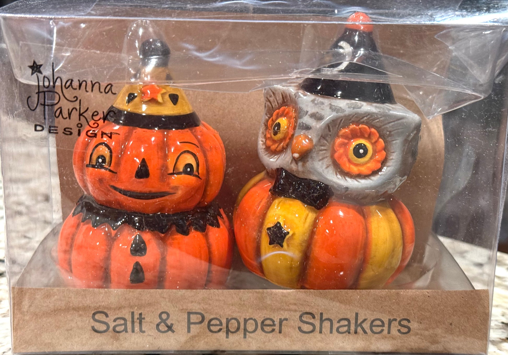 New Joanna Parker salt & pepper shaker set PUMPKIN/OWL