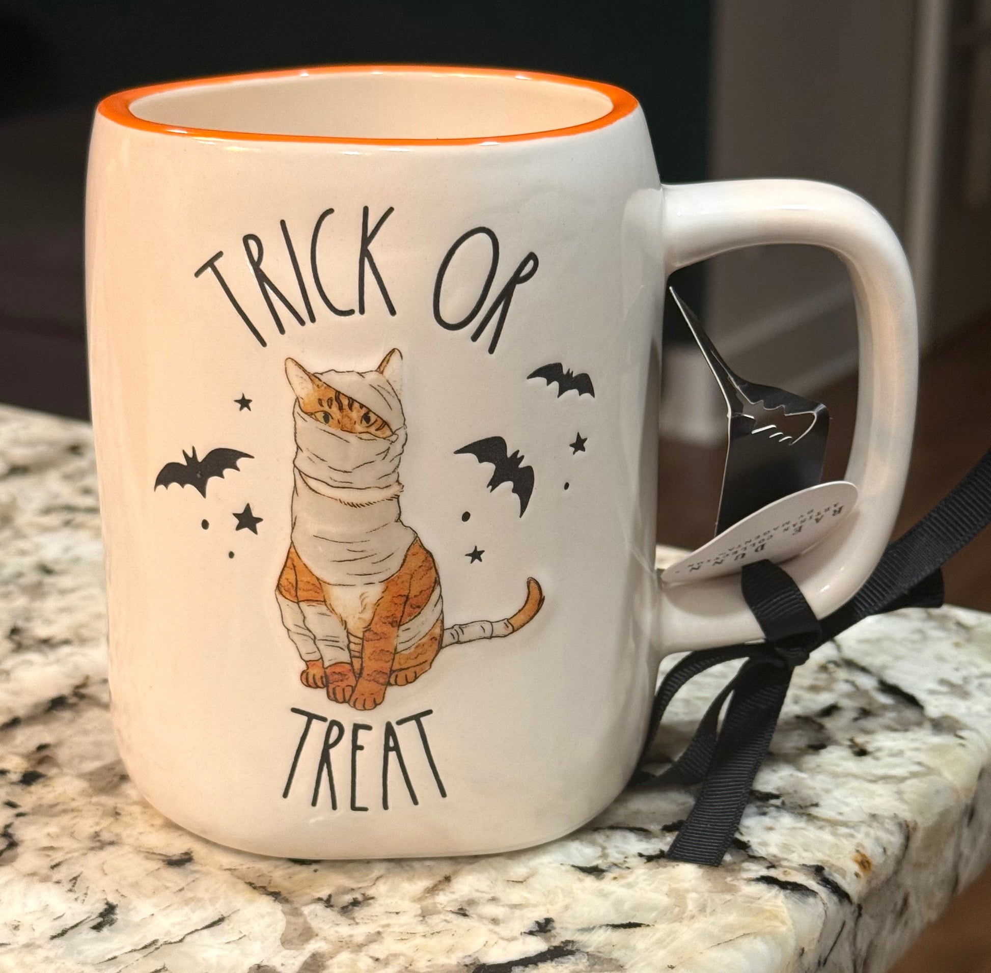 New Rae Dunn ceramic TRICK OR TREAT mummy cat coffee mug