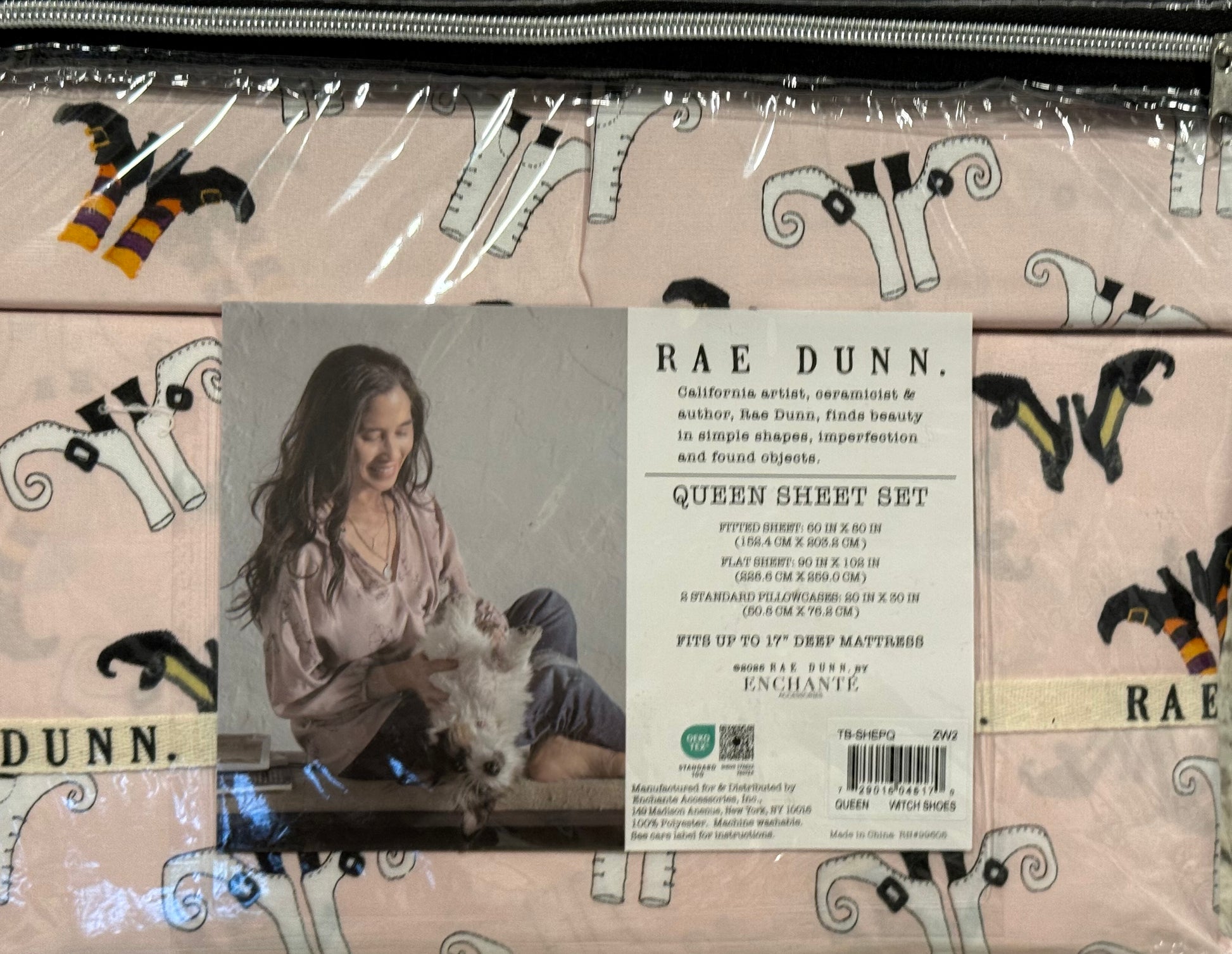 New Rae Dunn pink witches feet Halloween QUEEN sheet set