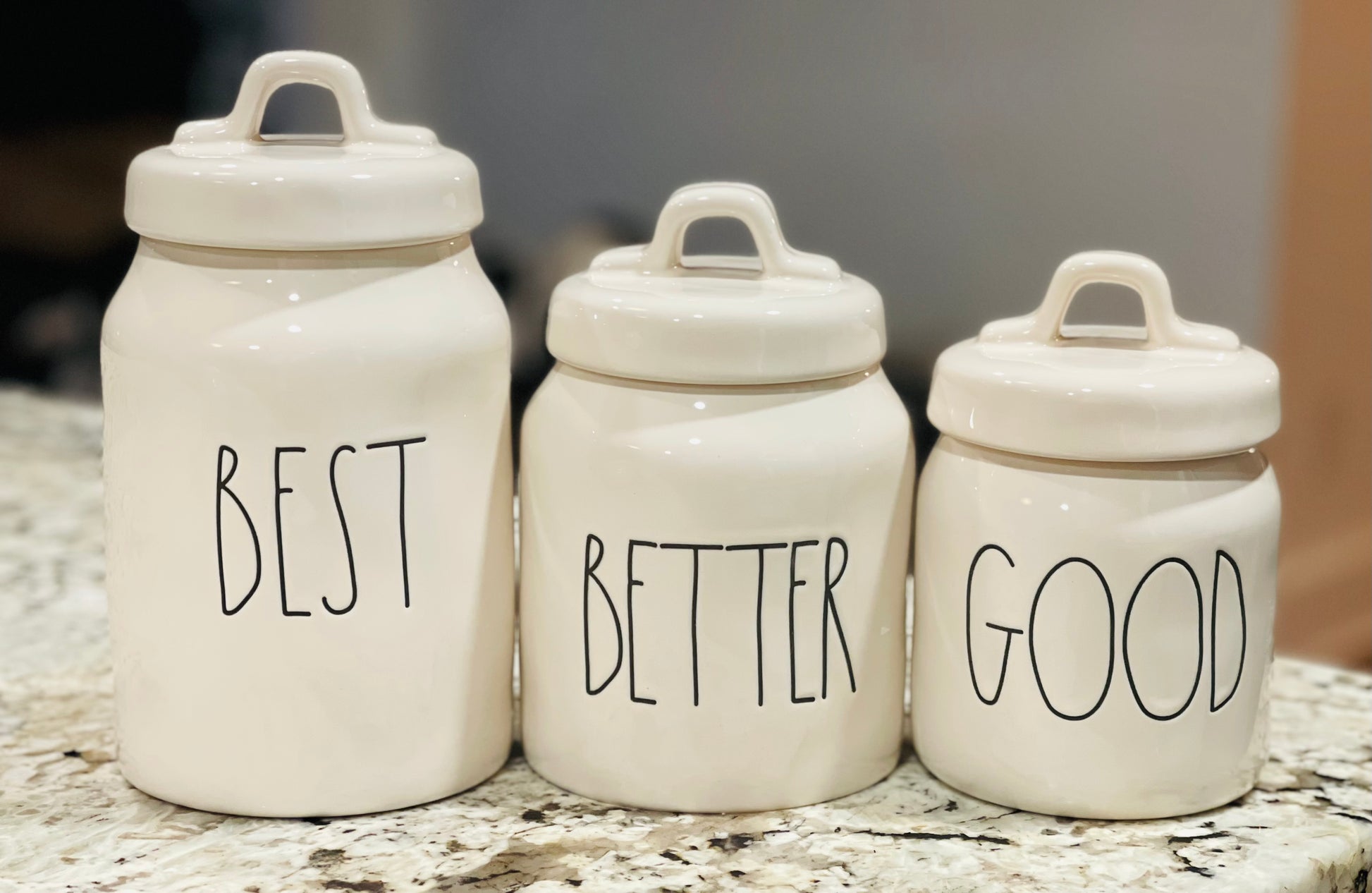 New Rae Dunn white ceramic 3-piece New Release canister set BEST, BETTER, GOOD (8.5 7 6.5” In size)