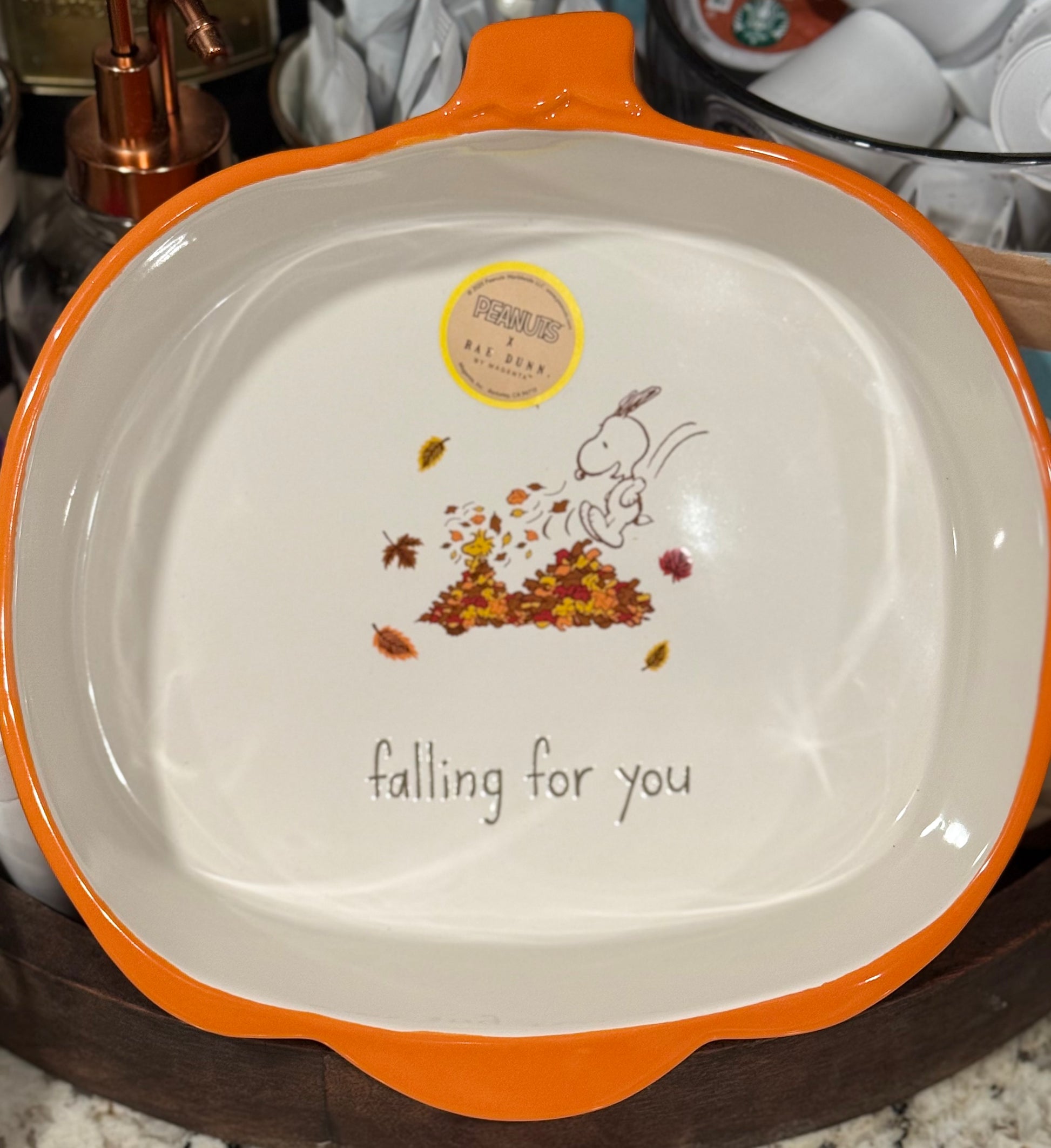 New Rae Dunn x Peanuts ceramic Snoopy fall pumpkin baking dish FALLIN FOR YOU