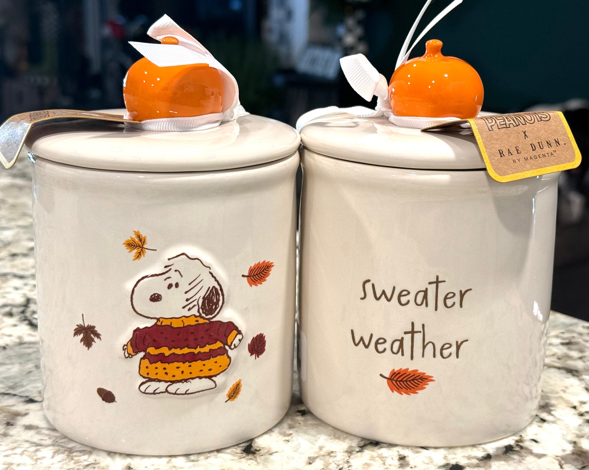 New Rae Dunn x Peanuts Snoopy ceramic SWEATER WEATHER fall canister 5.25”