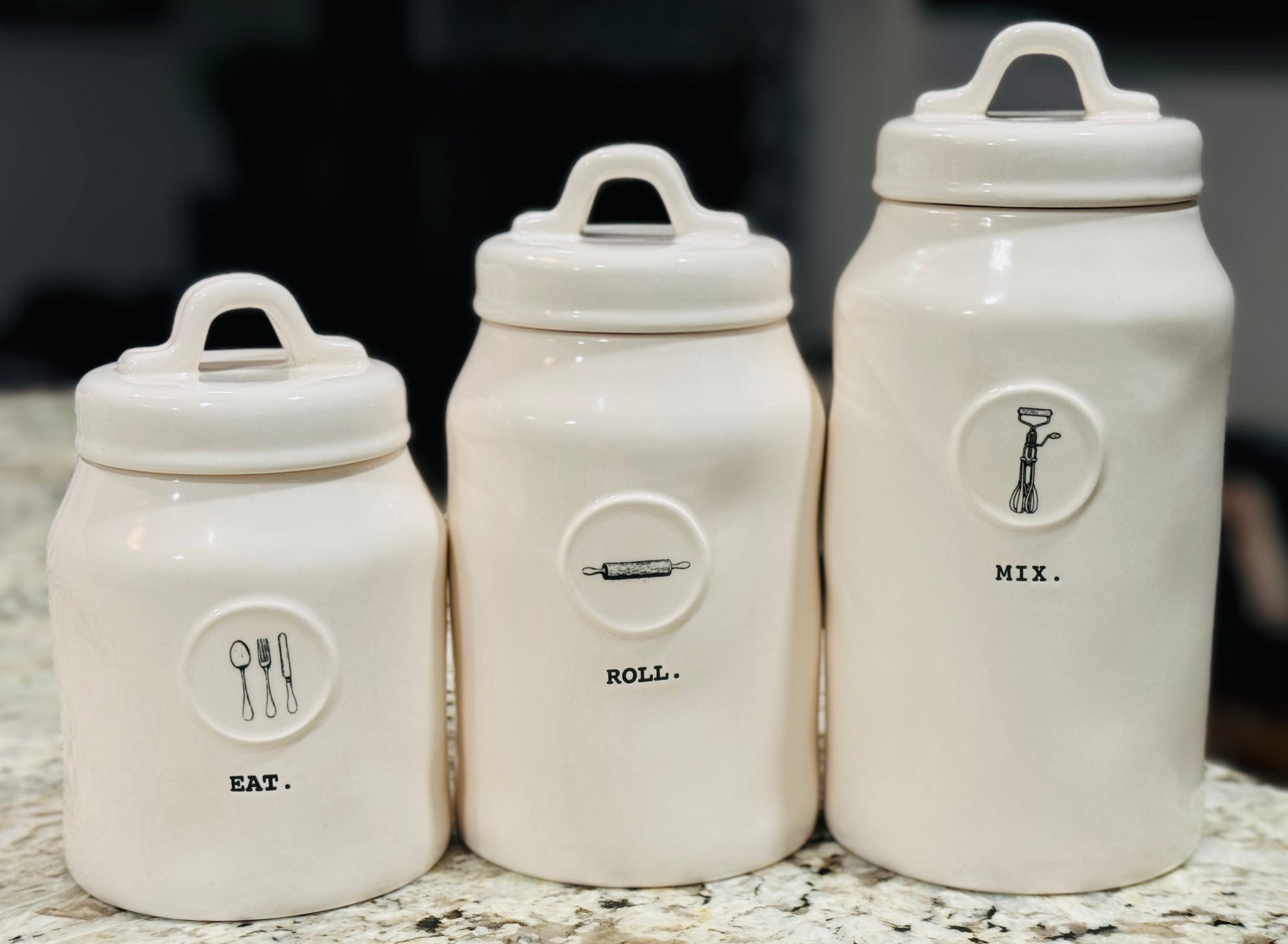 New Release Rae Dunn 3-piece Icon canister set EAT, ROLL, MIX